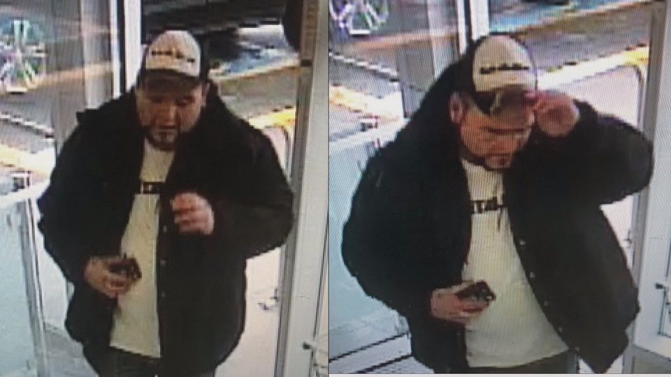 Surveillance footage shows a man wearing a black and white ball cap and a black jacket.
