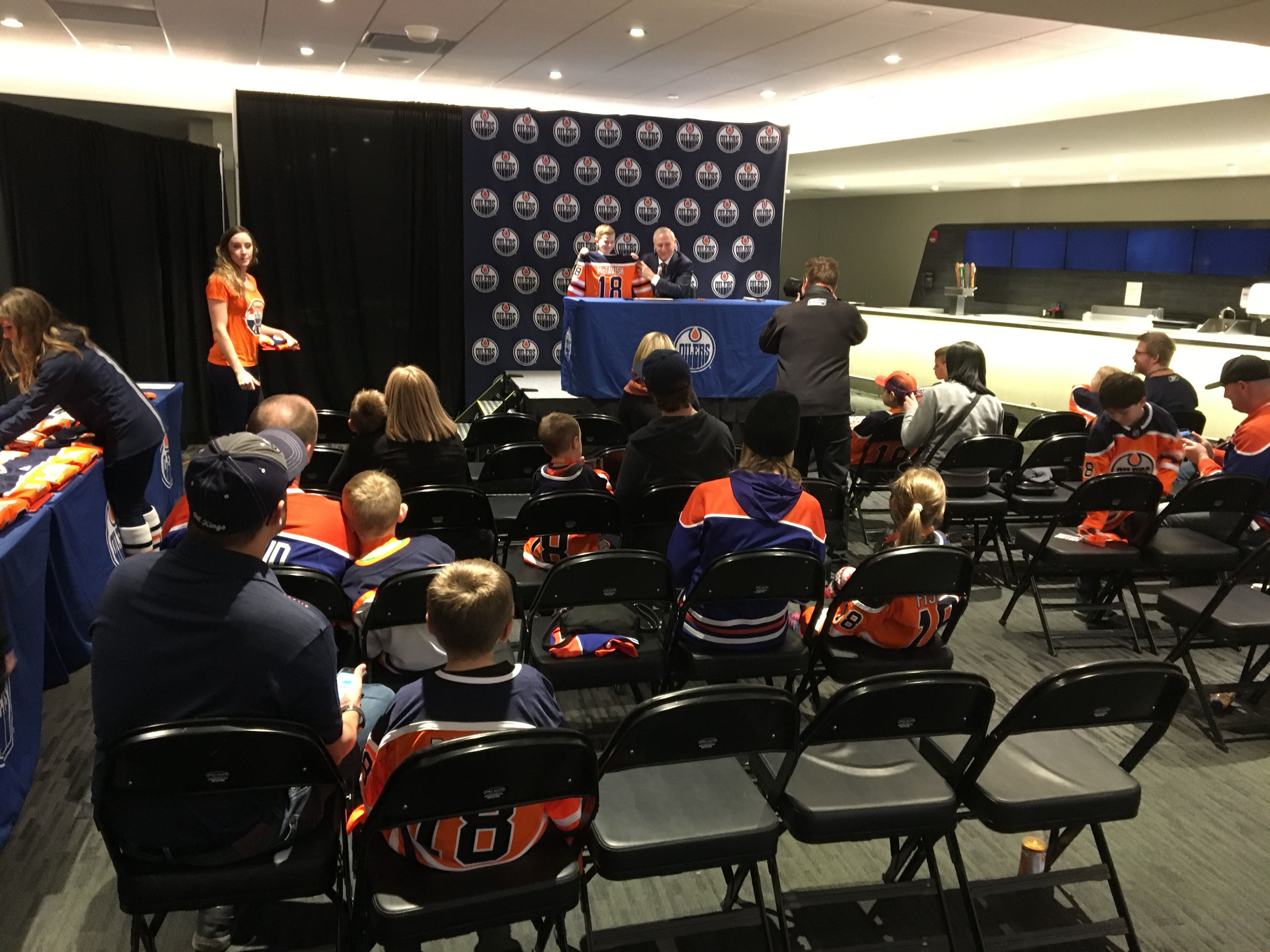 Sixty-four children signed one-day contracts with the Edmonton Oilers as part of Boston Pizza’s “Oiler for a day” and Family Skate on Sunday.
