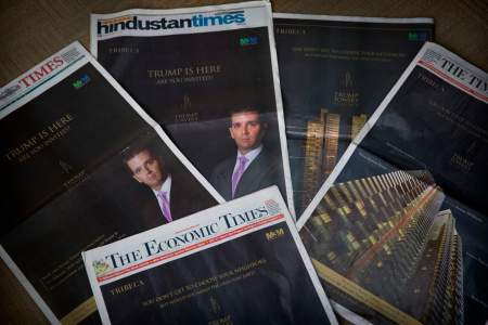The ads, which have run repeatedly in the past few days, herald the arrival not of the American president but of his eldest son, Donald Trump Jr., who is in New Delhi to sell luxury apartments and lavish attention on wealthy Indians who have already bought units in a Trump-branded development outside the Indian capital.
