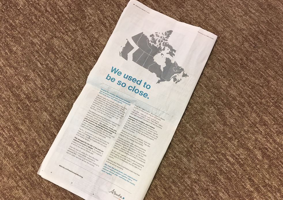 The Alberta government has taken its next step in the ongoing dispute between its province and British Columbia. Alberta has taken out a full page advertisement in the Vancouver Sun, Province newspaper, Victoria Times-Colonist, the Globe and Mail and the National Post pointing fingers at NDP premier John Horgan and his B.C. government.
