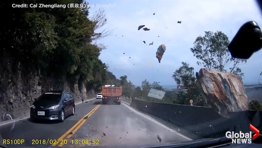 Shocking dash cam footage out of Taiwan captured the moment a massive hunk of rock fell onto a highway – missing a speeding car by just inches.