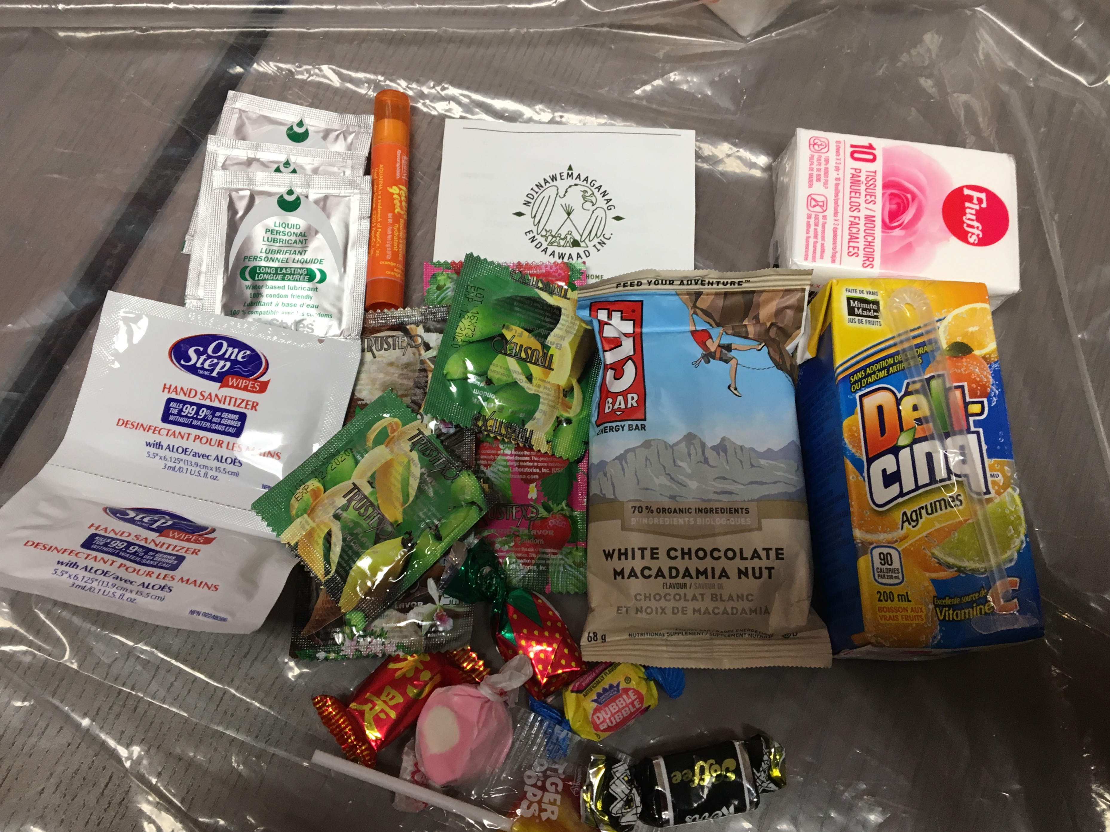 The safety kits Cumby and her teammate hand out include condoms, packs of lubrication, hand sanitizer wipes, chapstick, protein bars, sandwiches, juice boxes and water bottles.