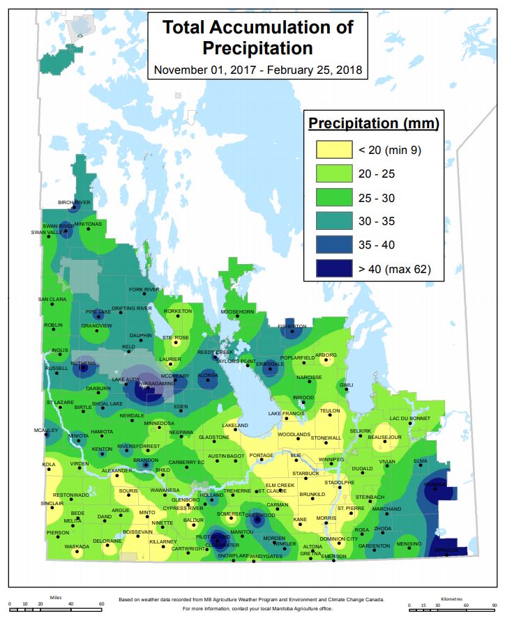 VIEW: the government of Manitoba precipitation map showing below average rain or snow since November