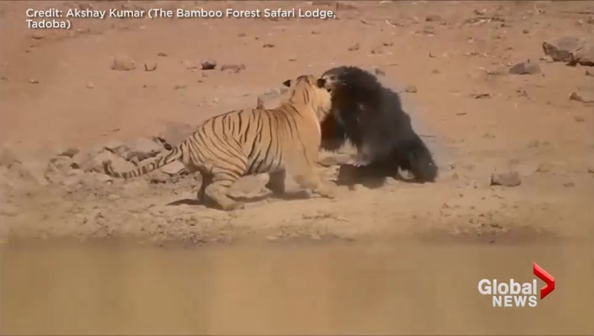 A violent fight between a male tiger and a female sloth bear at Tadoba National Park in Western Maharashtra state in India was captured on camera on Wednesday.