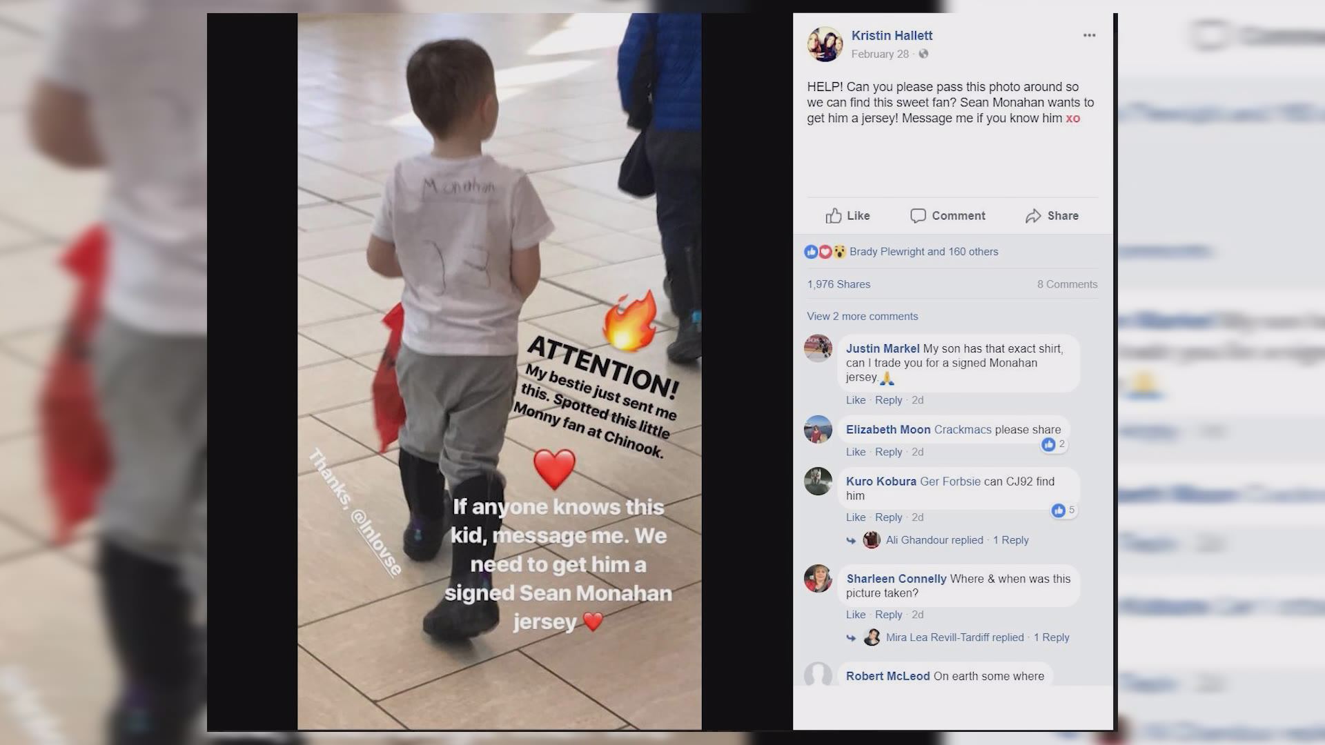 The photo was sent to Calgary Flames TV host and producer Kristin Hallett who embarked on a social media search to find the boy.