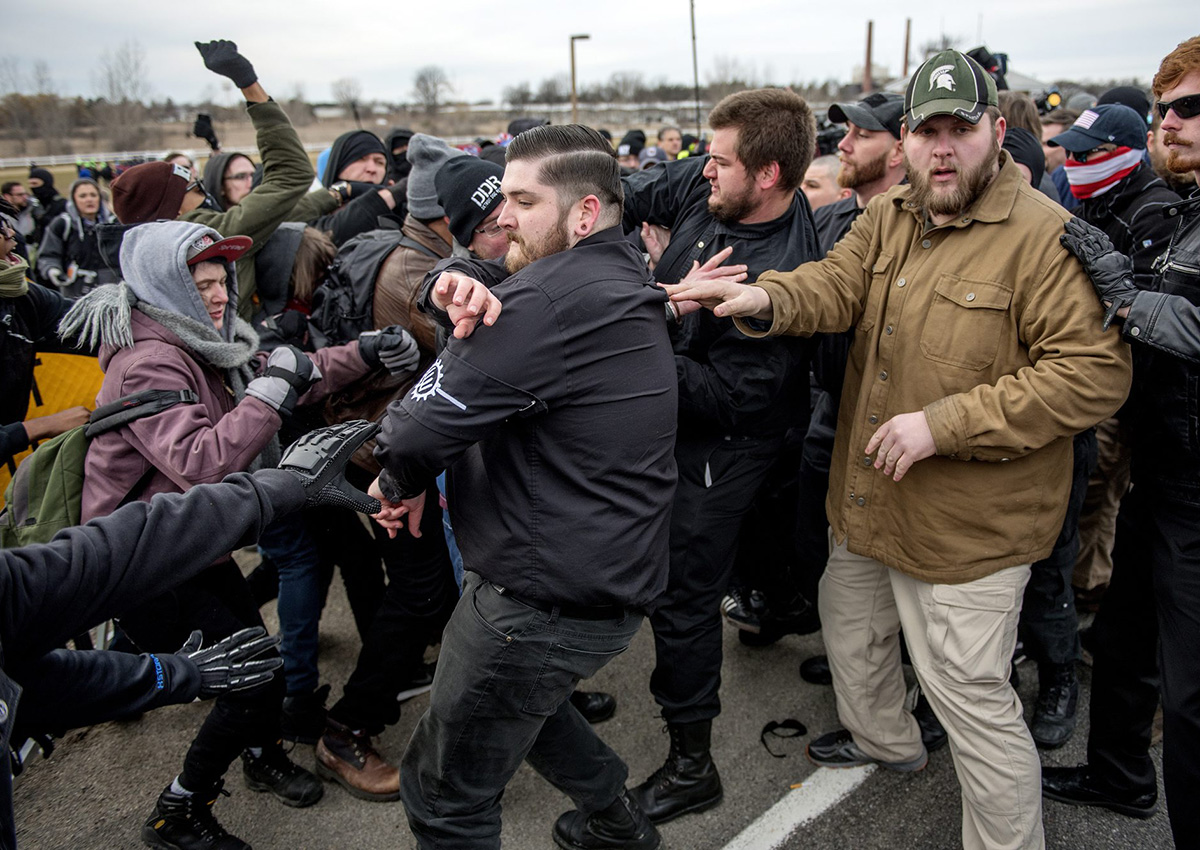 Fistfights broke out on a road leading to Michigan State University in East Lansing as about 40 backers of Spencer walked up a road leading to the campus, where roughly 500 demonstrators had gathered, surrounding an armored police vehicle.