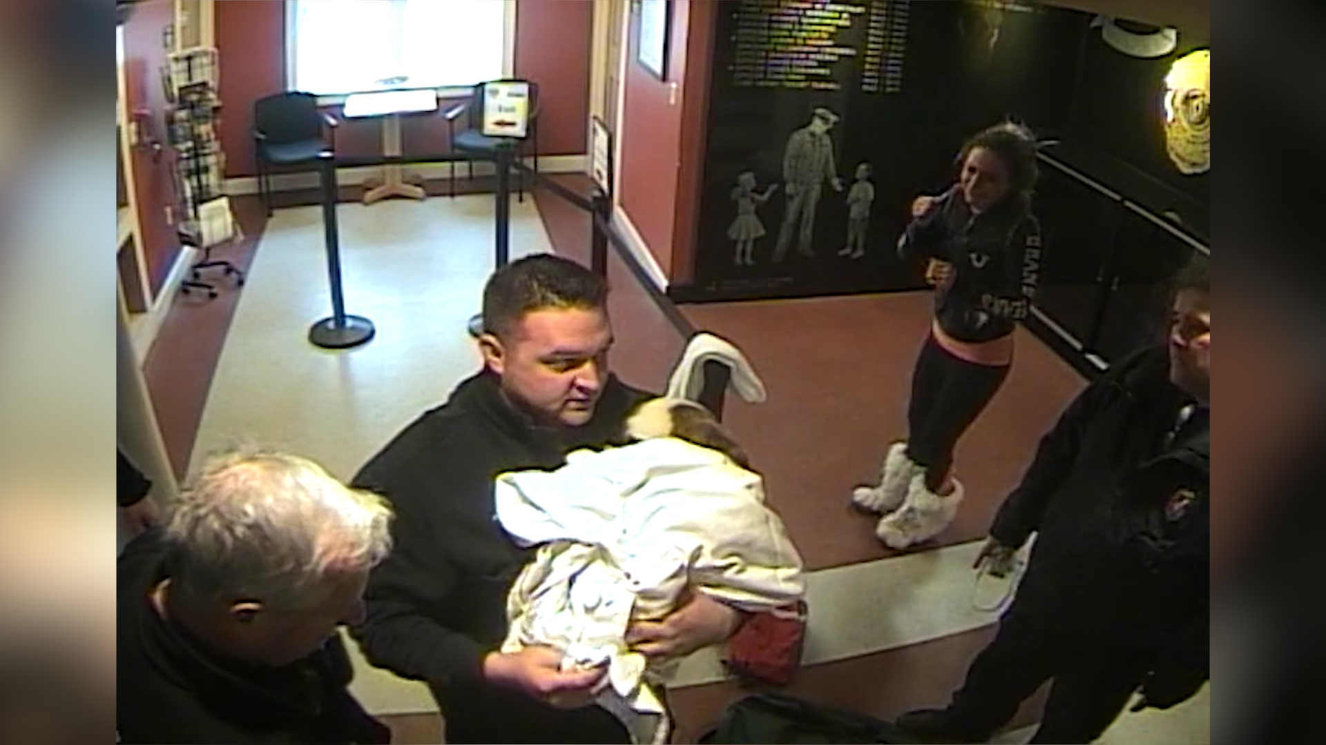 The incident, which was captured on surveillance video, began when Megan Vitale ran into the police station in search of help.