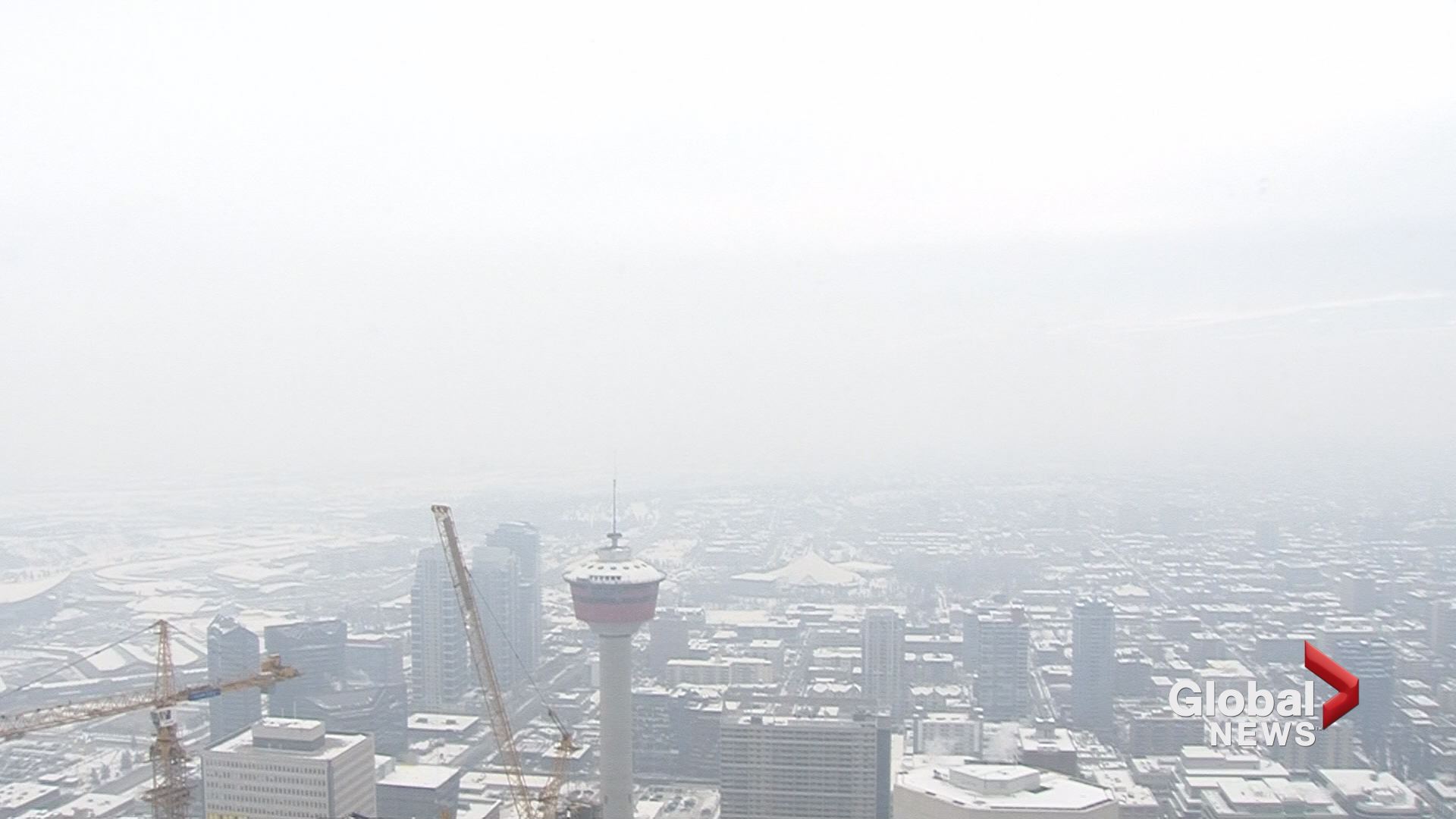 Although this is not a frequent occurrence in Calgary it does sometimes happen as a chinook is unfolding. At first, warmer air will ride over the heavier, cold air on the surface causing pollutants, which normally get carried away on rising air currents, to get trapped at ground level.