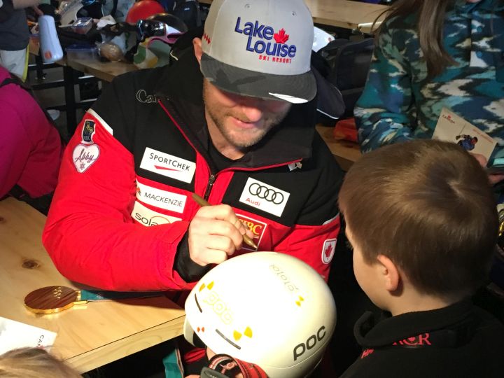 Brady Leman grew up skiing the slopes of the Calgary area and he returned to Nakiska Friday as an Olympic champion in ski cross. Hundreds of young skiers were thrilled to meet him, get their helmets signed and touch his gold medal.
