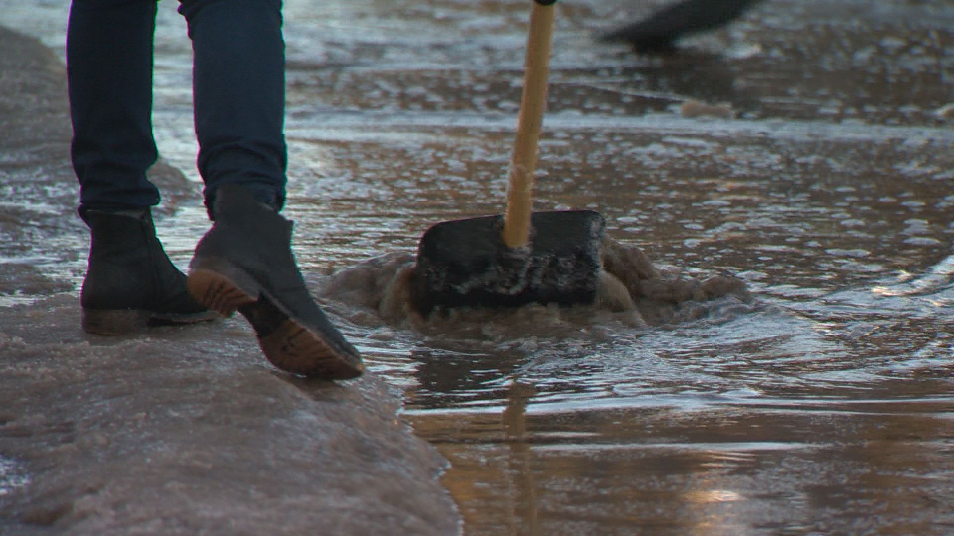 Shovels are out in full force in some neighbourhoods around Calgary, but instead of picking up snow, residents are pushing away water.