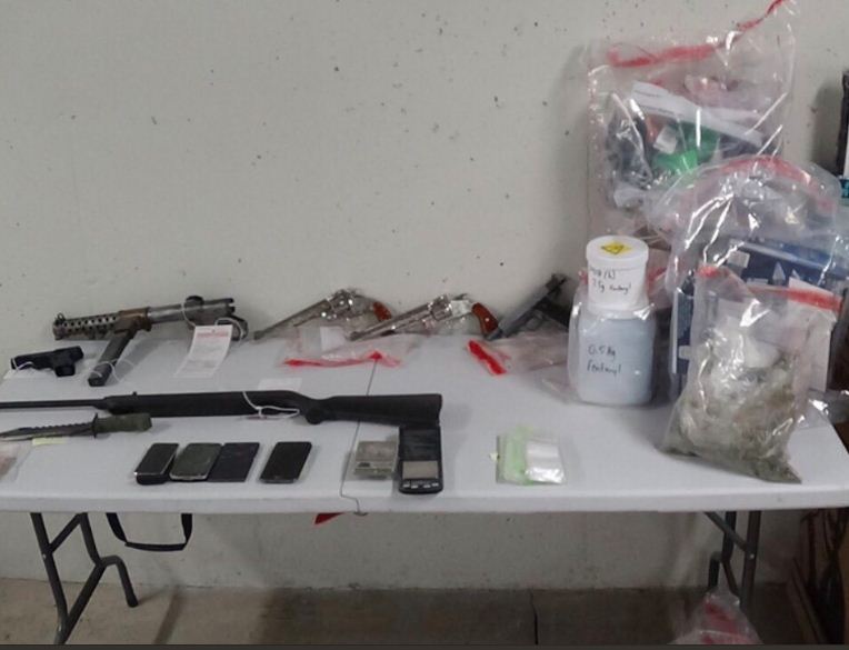 Officers seized several replica firearms, a submachine gun, knives and identity documents, along with over $70,000 worth of drugs, including suspected Fentanyl and Meth.