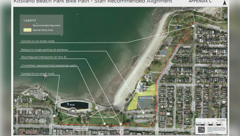 At issue is the point where the route, which starts off running parallel along Cornwall Avenue, hits Yew Street from the west. The proposal calls for the path to cut through the green space surrounding the south parking lot and the tennis courts, before continuing its parallel path north along Arbutus Street.