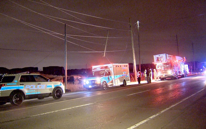 Power has been restored to customers after a vehicle crashed into a pole and downed power lines in Brampton.