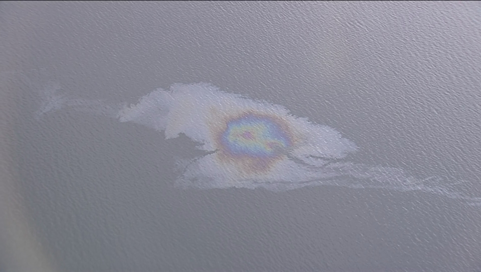The Global 1 helicopter caught sight of a sheen of fuel-like liquid sitting on top of the water at around 5:30 p.m. The images show a long trail of liquid spreading in the bay.