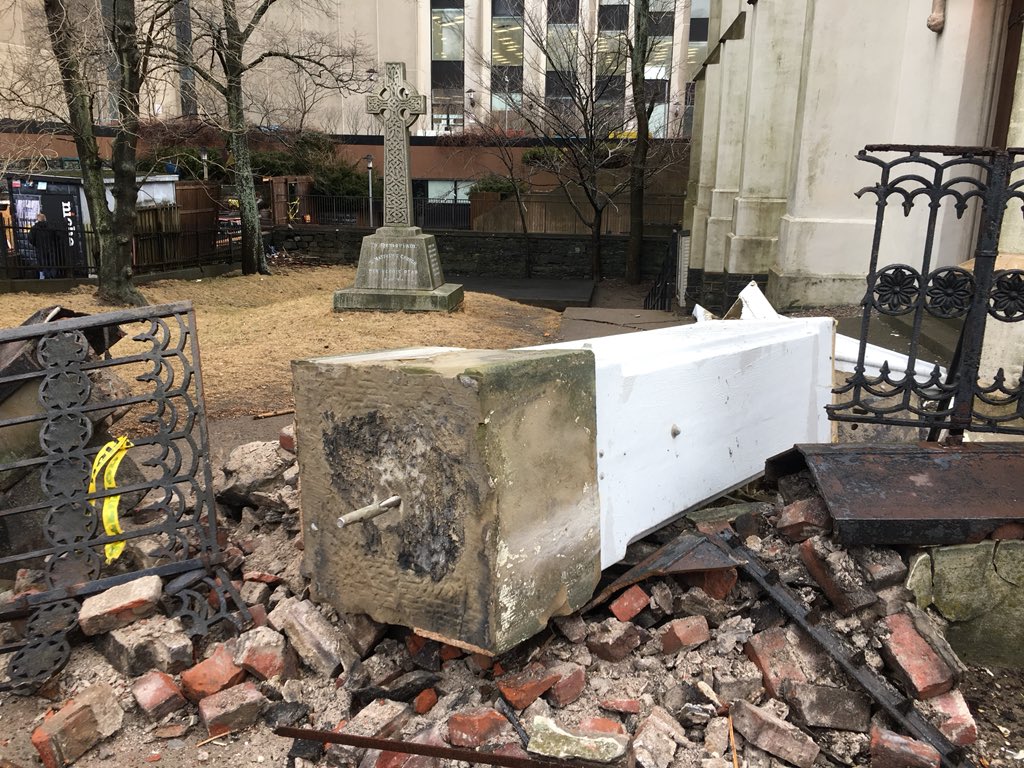 The main steeple withstood the gusts, but one of the four smaller surrounding steeples had plunged to the ground, breaking part of a wrought iron fence that lined the sidewalk.
