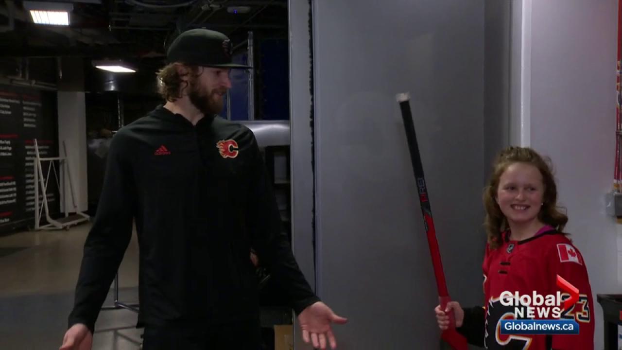A young Calgary Flames fan who sent injured goalie Mike Smith a “get well soon” letter got the ultimate thank you on Tuesday night.