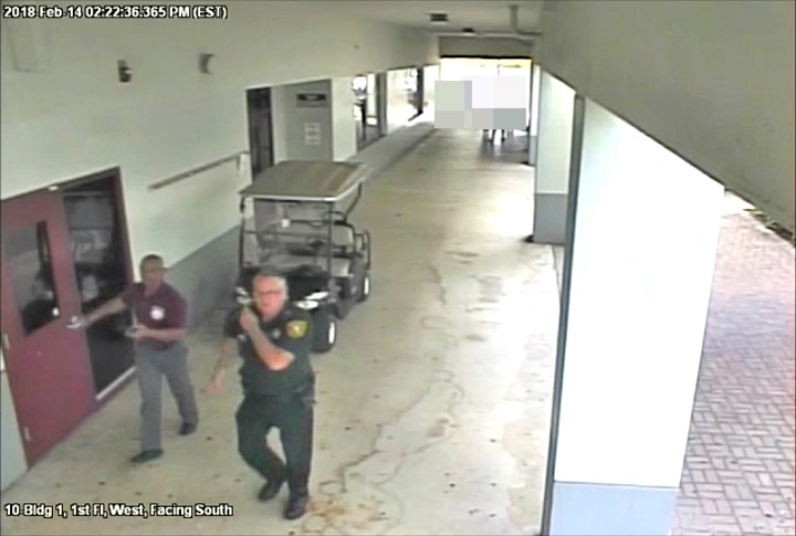 Security video shows a Florida sheriff’s deputy going toward the high school building while a gunman massacred 17 students and staff members, but he then backed away and stayed outside with his handgun drawn.