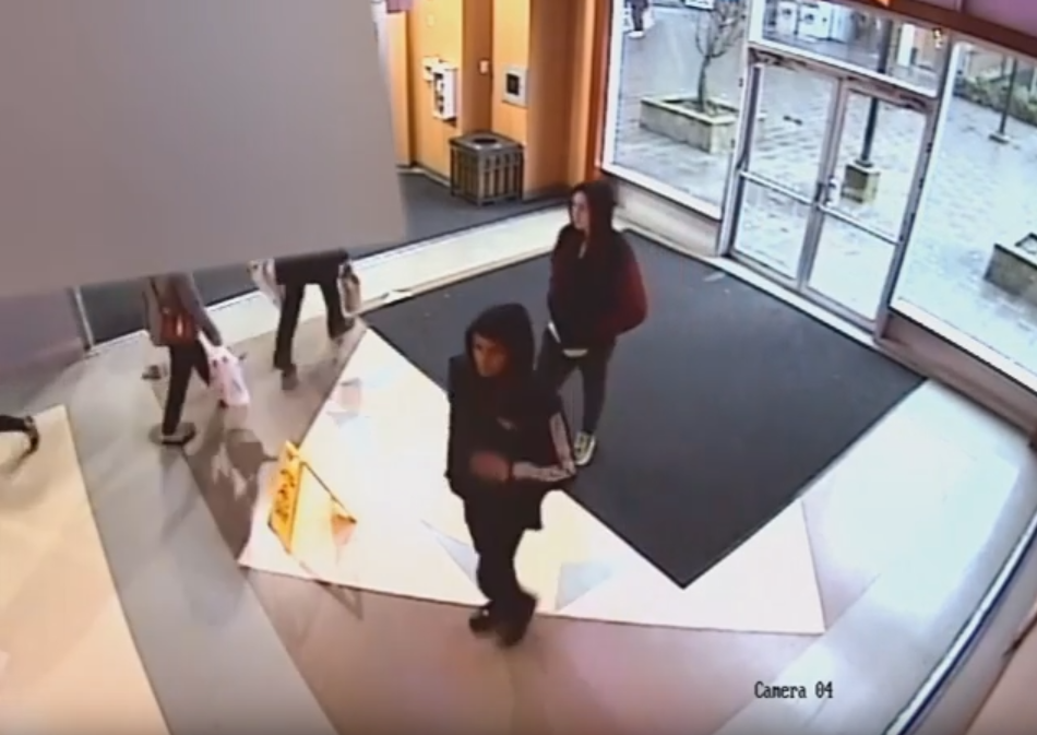 Video released by the RCMP shows the two suspects walking into a mall, wearing hoods.