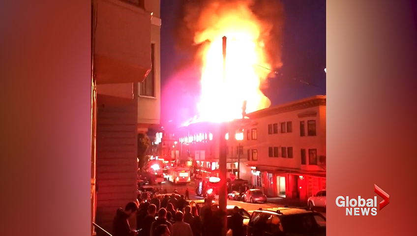 Photos showed the fire burned above a liquor store and other businesses. Firetrucks with their lights flashing surrounded the site in the North Beach neighborhood.