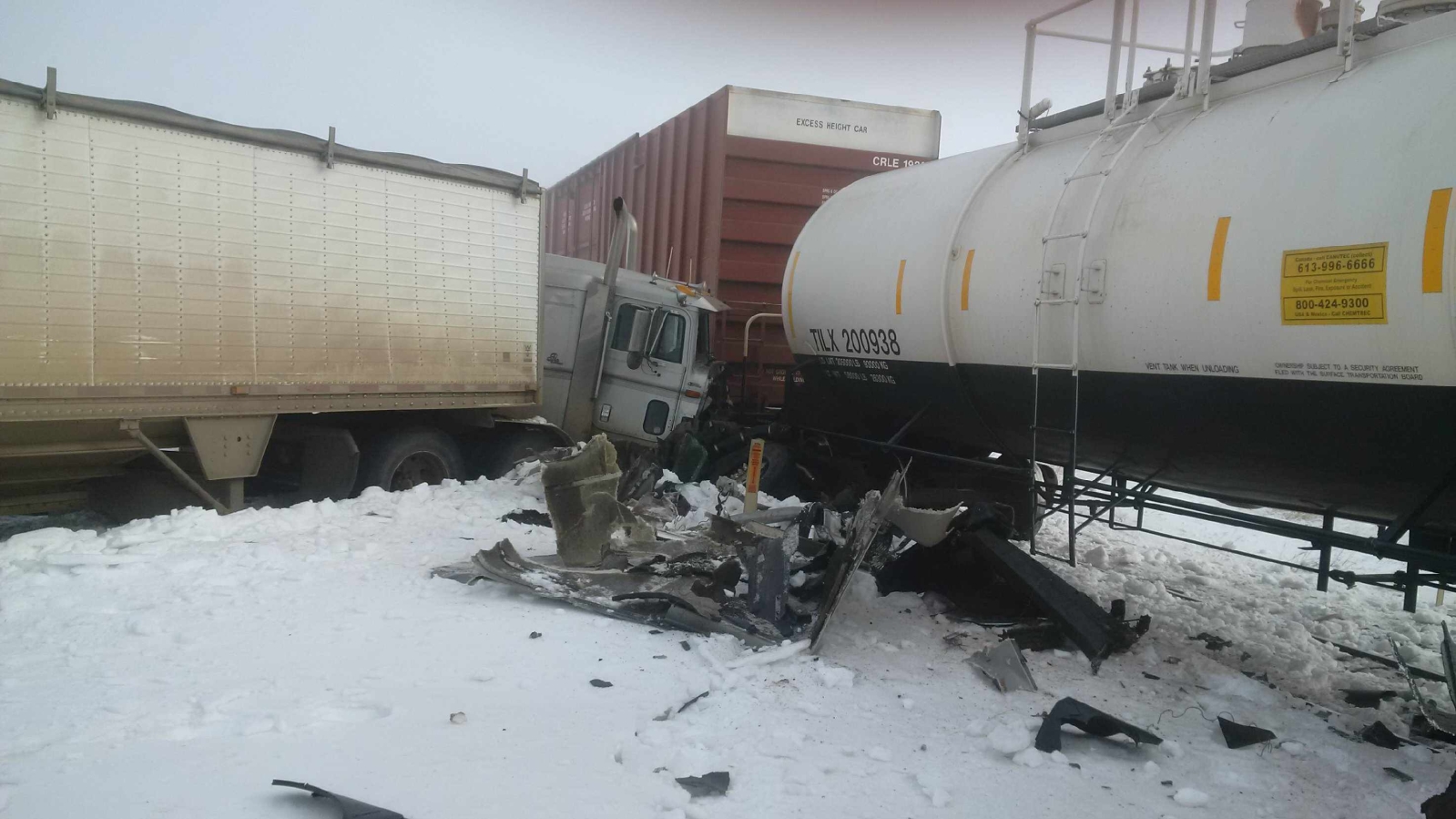 The crash caused the train to derail and block the highway.