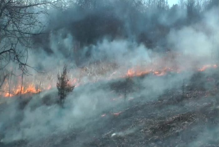 The owner of the home said he was cutting wood at the bottom of the hill and as he took one load up the hill, he noticed the grass fire at the bottom of the hill and called 911.