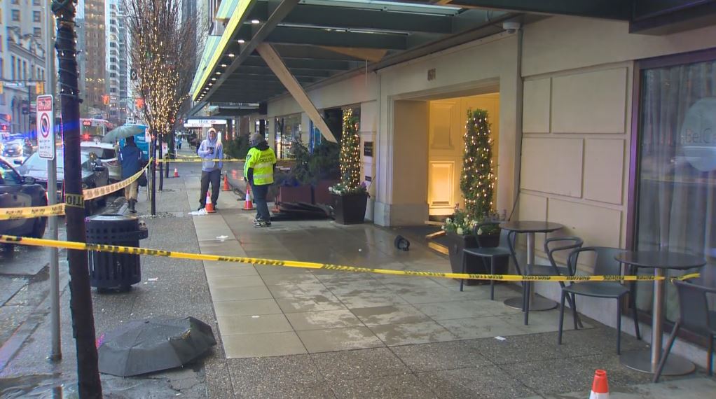 Vancouver police say a worker fell through a wood panel while he was cleaning the nearby glass early Monday morning. He apparently was power-washing the canopy above the front door when he stepped onto the board and it gave way. The man landed on the pavement below.