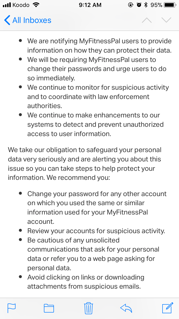 Under Armour informed MyFitnessPal users on March 29, 2018, that 150 million accounts were affected by a data breach that took place in February 2018. MyFitnessPal is an app designed for tracking diet and exercise.