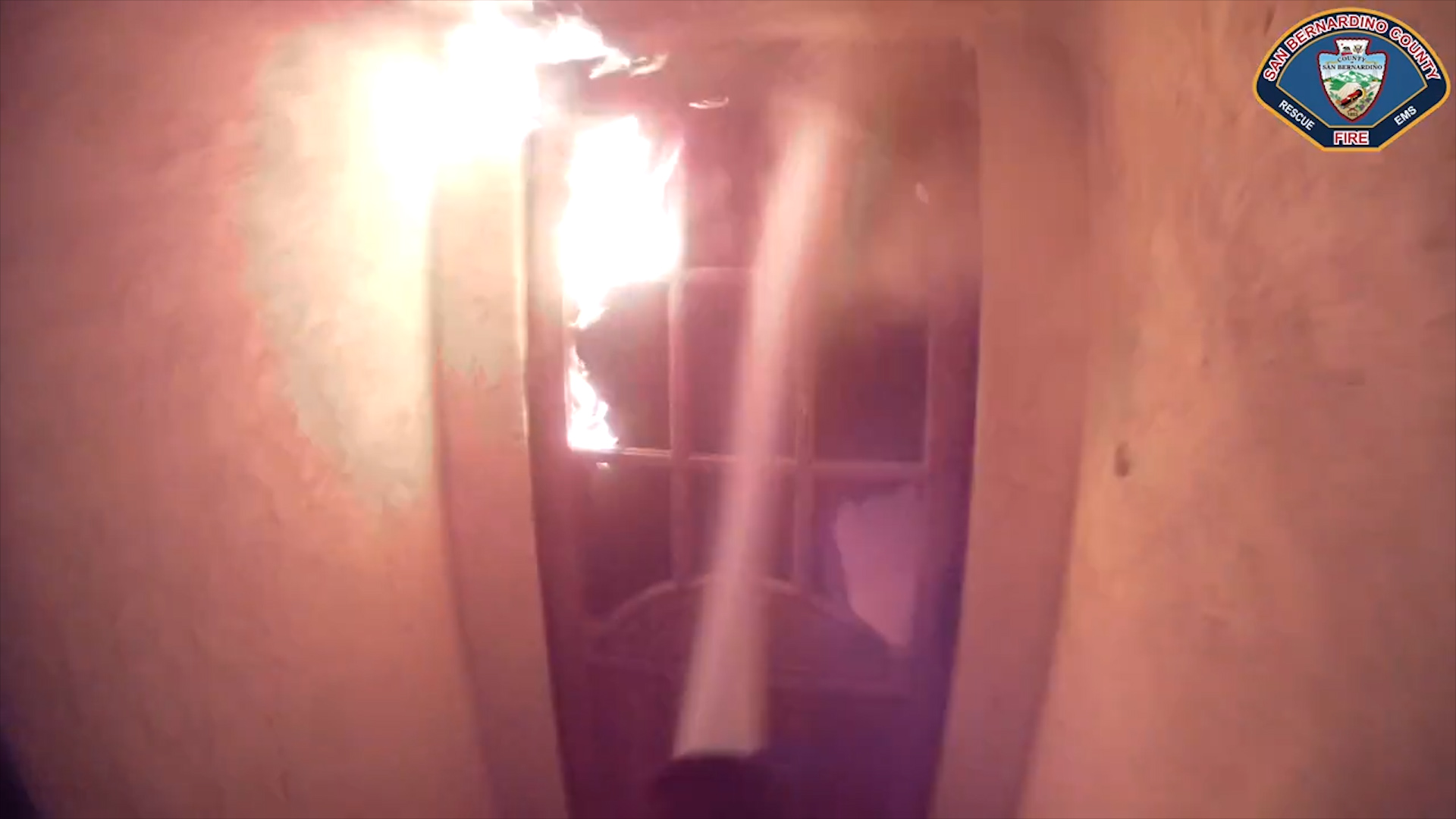 The footage, posted on Facebook by San Bernardino County Fire, shows the firefighter at the entrance to the home and picking up the fire hose to spray flames blocking the way in, before entering the building.