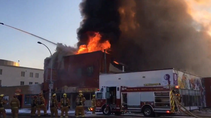 Firefighters remain at the scene of a major blaze at Lang’s Cafe on Broad Street in downtown Regina.