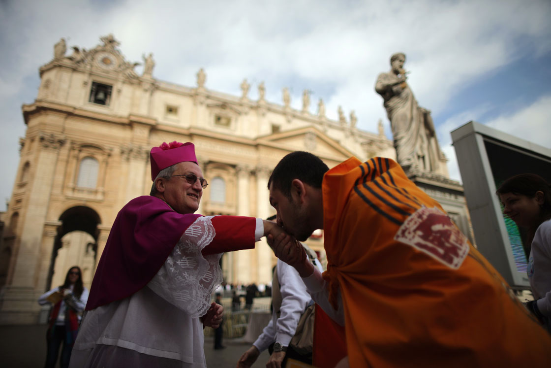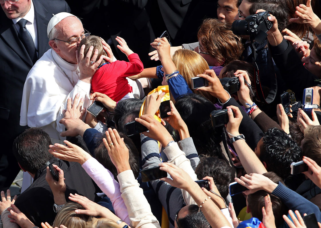 At the end of the two-hour Mass, Francis took off his red vestments, leaving only the white cassock and skull cap, and climbed into an open-topped popemobile to circle through the enthusiastic crowd. He leaned out to shake hands, kissed and patted the heads of infants passed to him by bodyguards, and often gave children the thumbs-up sign.