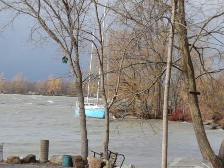 According to Judy Greenwood-Speers, a Wolfe Island resident who snapped a picture of the sailboat, the boat is currently loose and banging up against an old coal dock just east of the village on Wolfe Island.