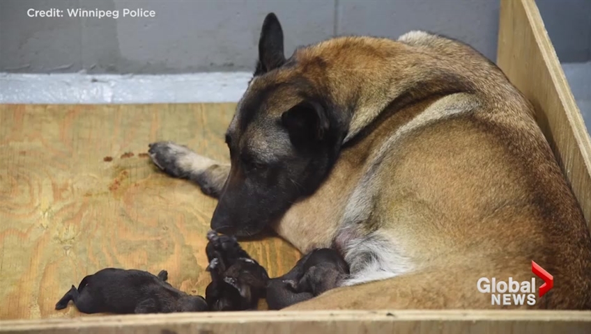 Police Dog Veyda began labour at 3:30 a.m. Thursday morning. As of 1:15 p.m., she was still in labour, having given birth to several puppies earlier in the day.