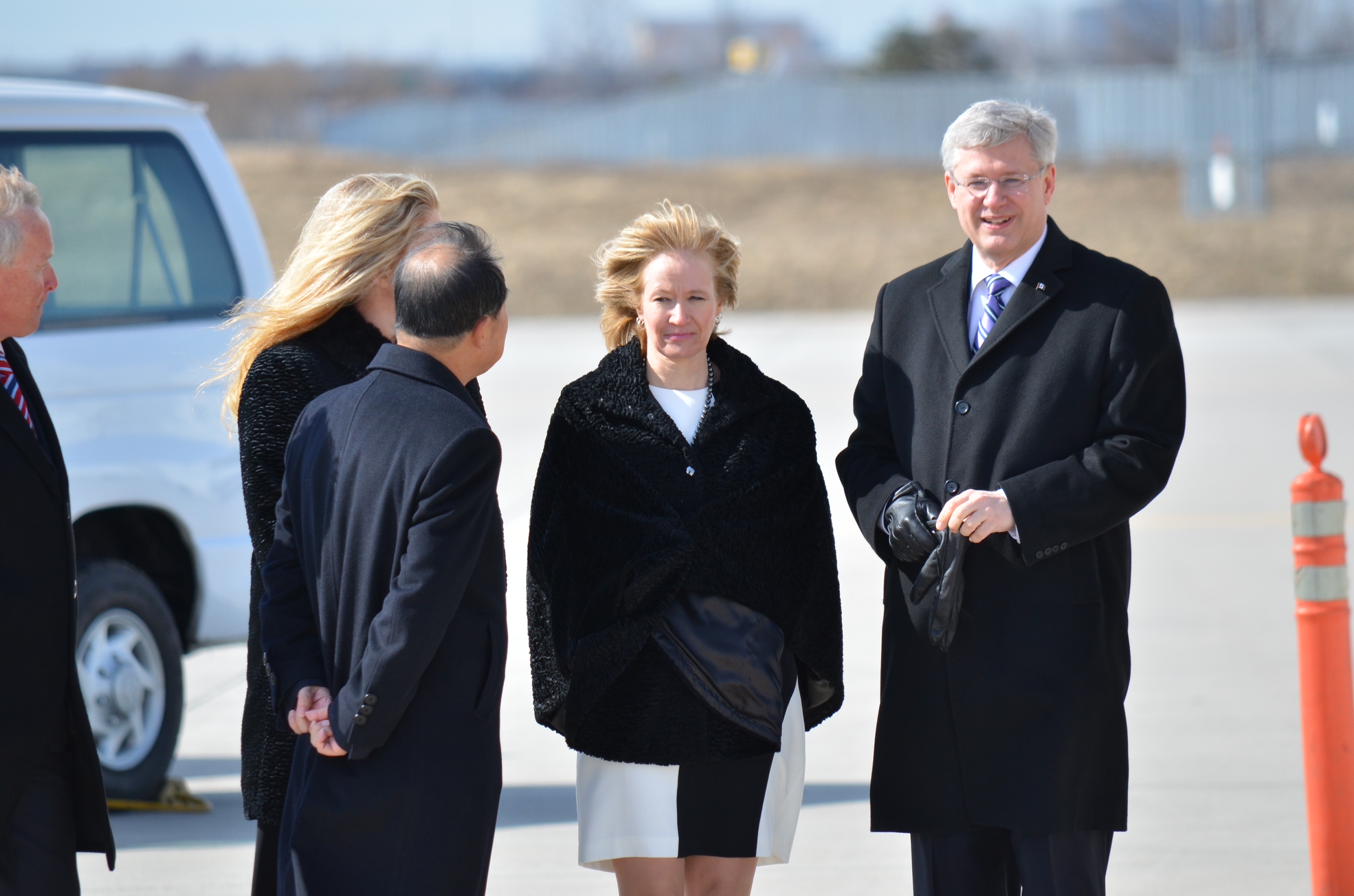 Prime minister Stephen Harper and China’s ambassador to Canada, Zhang Junsai, greeted the bears at an airport hangar.