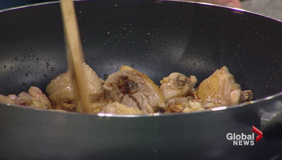 3/ Brown the chicken’s surface. Add rice wine and soy sauce. Continue to stir-fry the chicken.