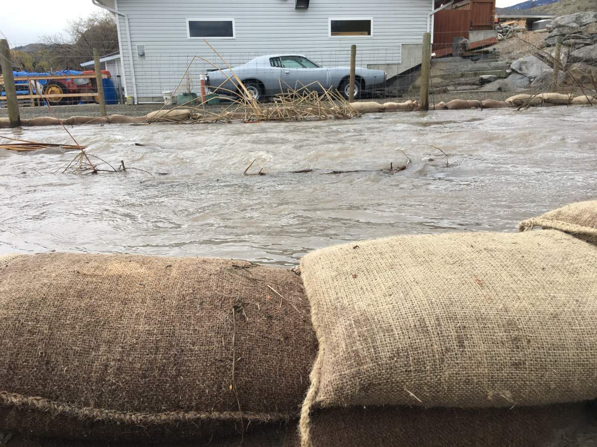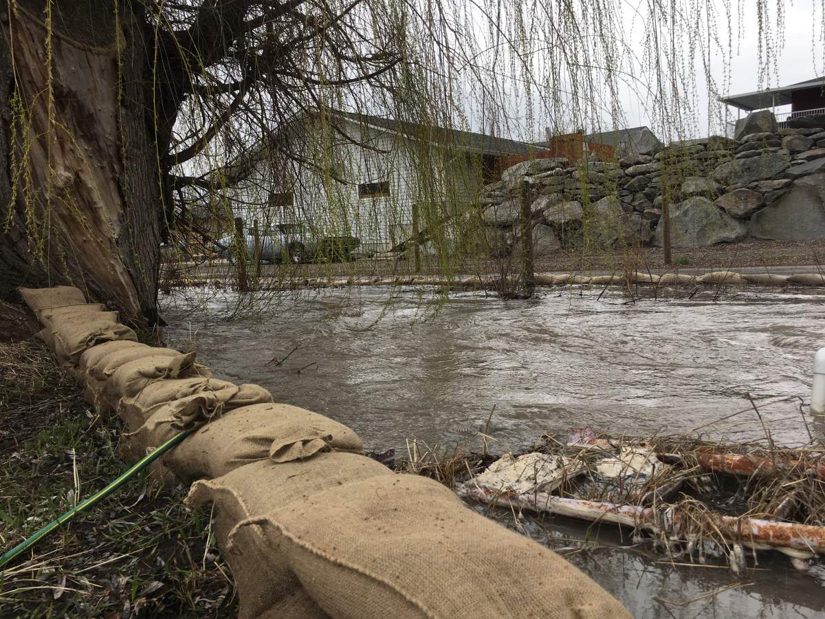Joe Eckenswiller owns a home off Highway 97 and Sportsmens Bowl Road. The creek flows through the property and is overflowing. Walls of sandbags have been erected to keep the creek within its banks.