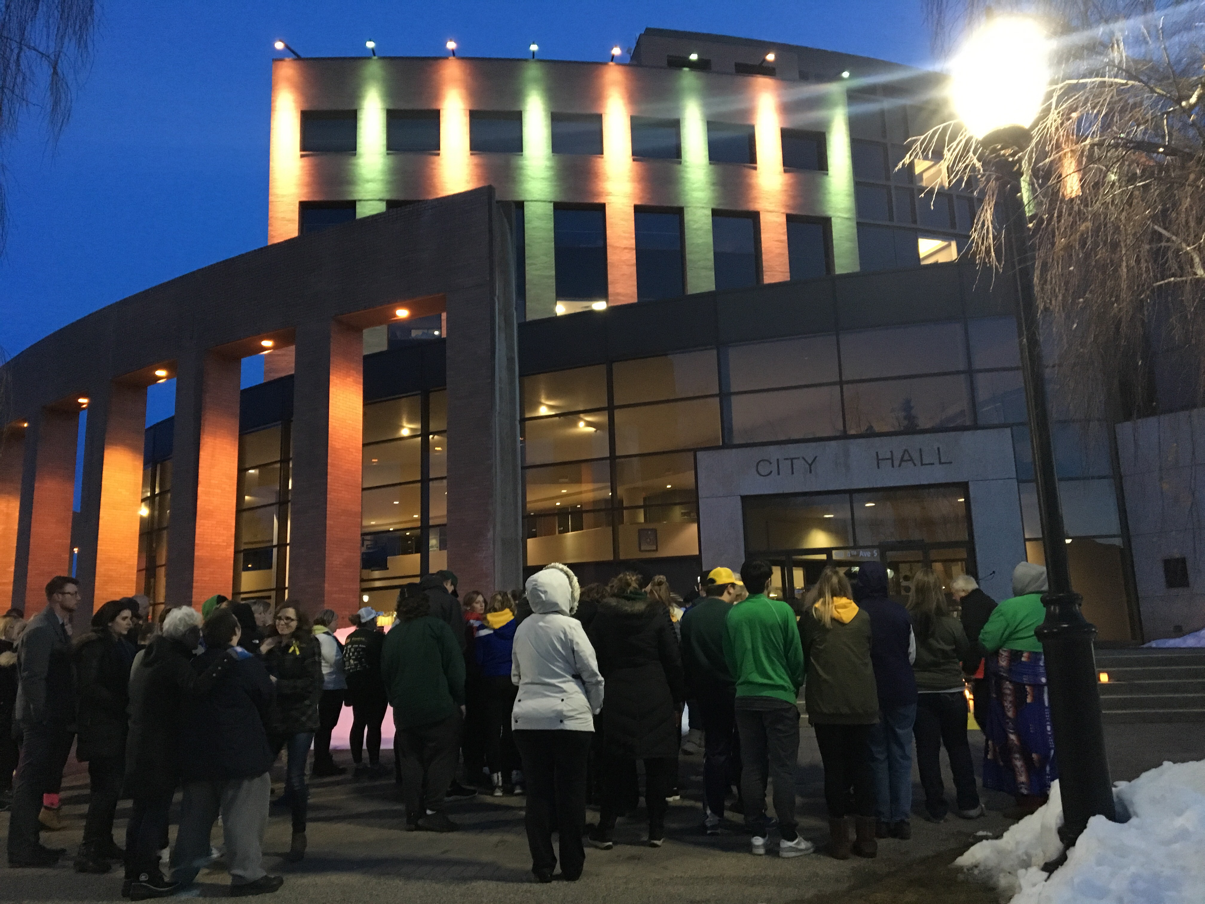 The 90-minute vigil was held outside city hall, which was lit up green and gold–the colours of the Humboldt Broncos.