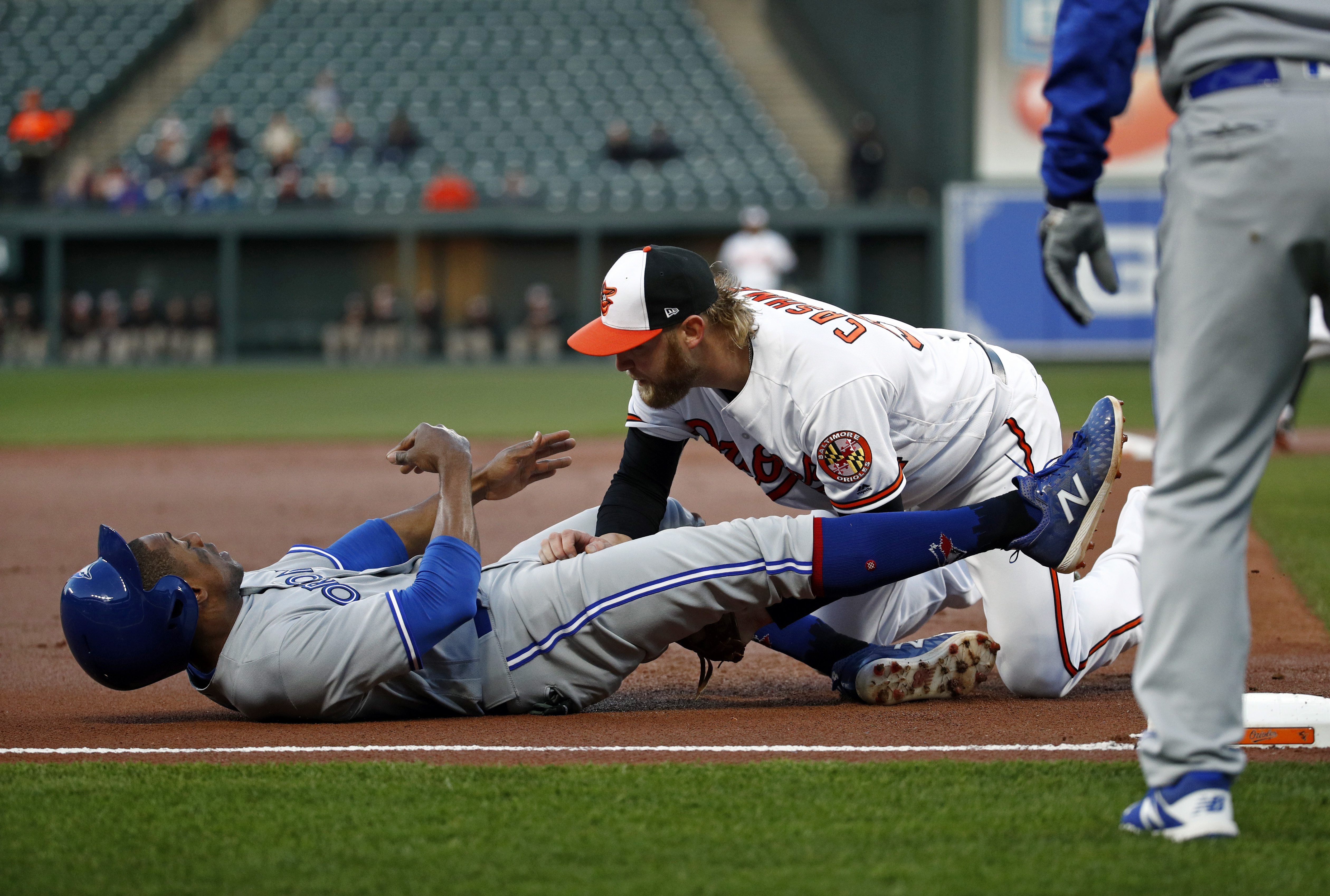 BALTIMORE – Aaron Sanchez lost his no-hit bid when Baltimore’s Tim Beckham led off the eighth inning with a sharp grounder through the legs of third baseman Josh Donaldson, and Curtis Granderson hit a tiebreaking homer in the ninth to carry the Toronto Blue Jays over the Orioles 2-1 on Tuesday night.