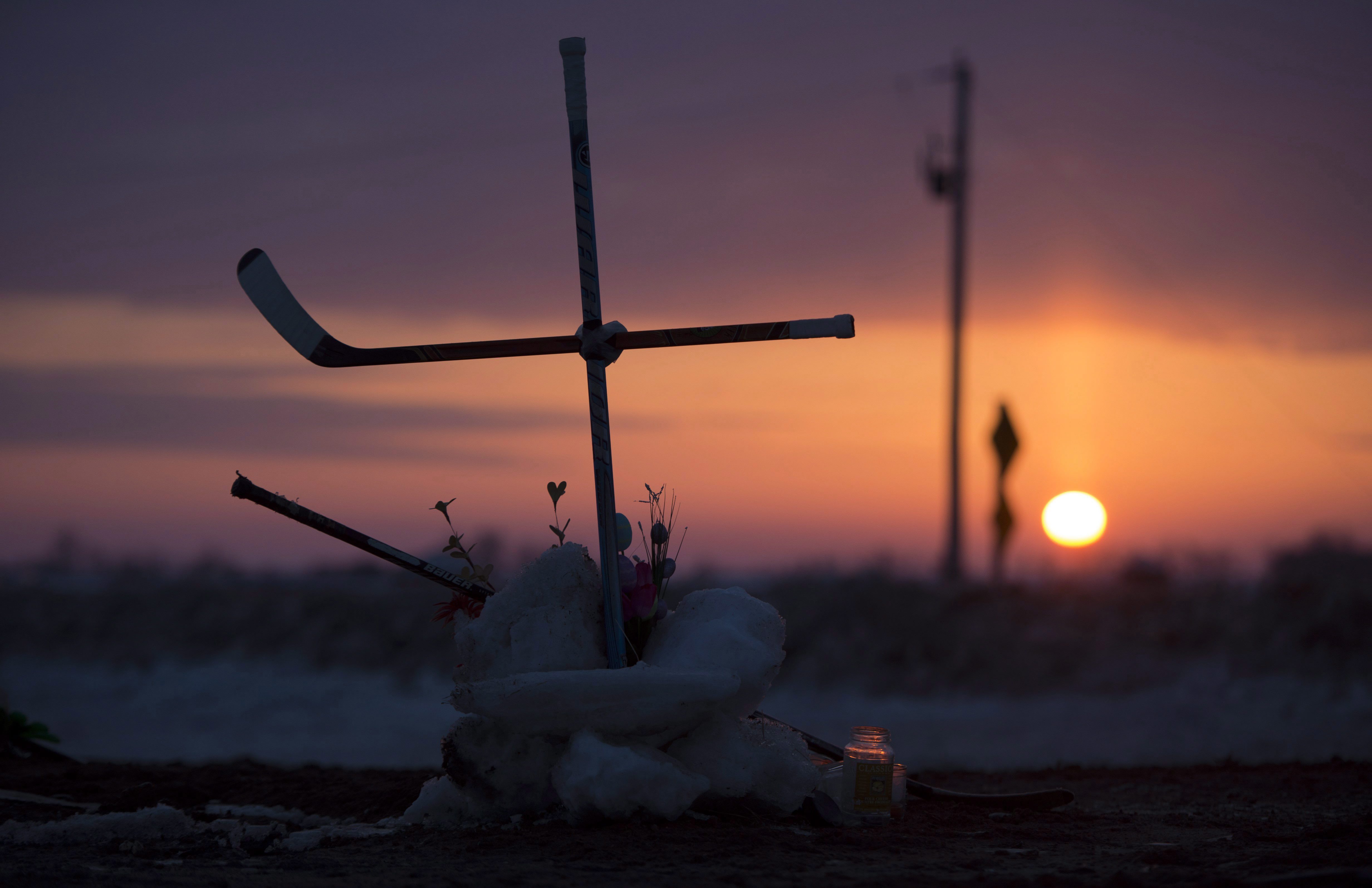 The sun rises across the Prairies as a cross made out of hockey sticks is seen at a makeshift memorial at the intersection of of a fatal bus crash near Tisdale, Sask., Tuesday, April, 10, 2018. A bus carrying the Humboldt Broncos hockey team crashed into a truck en route to Nipawin for a game Friday night, killing 15 and sending more than a dozen more to hospital. THE CANADIAN PRESS/Jonathan Hayward