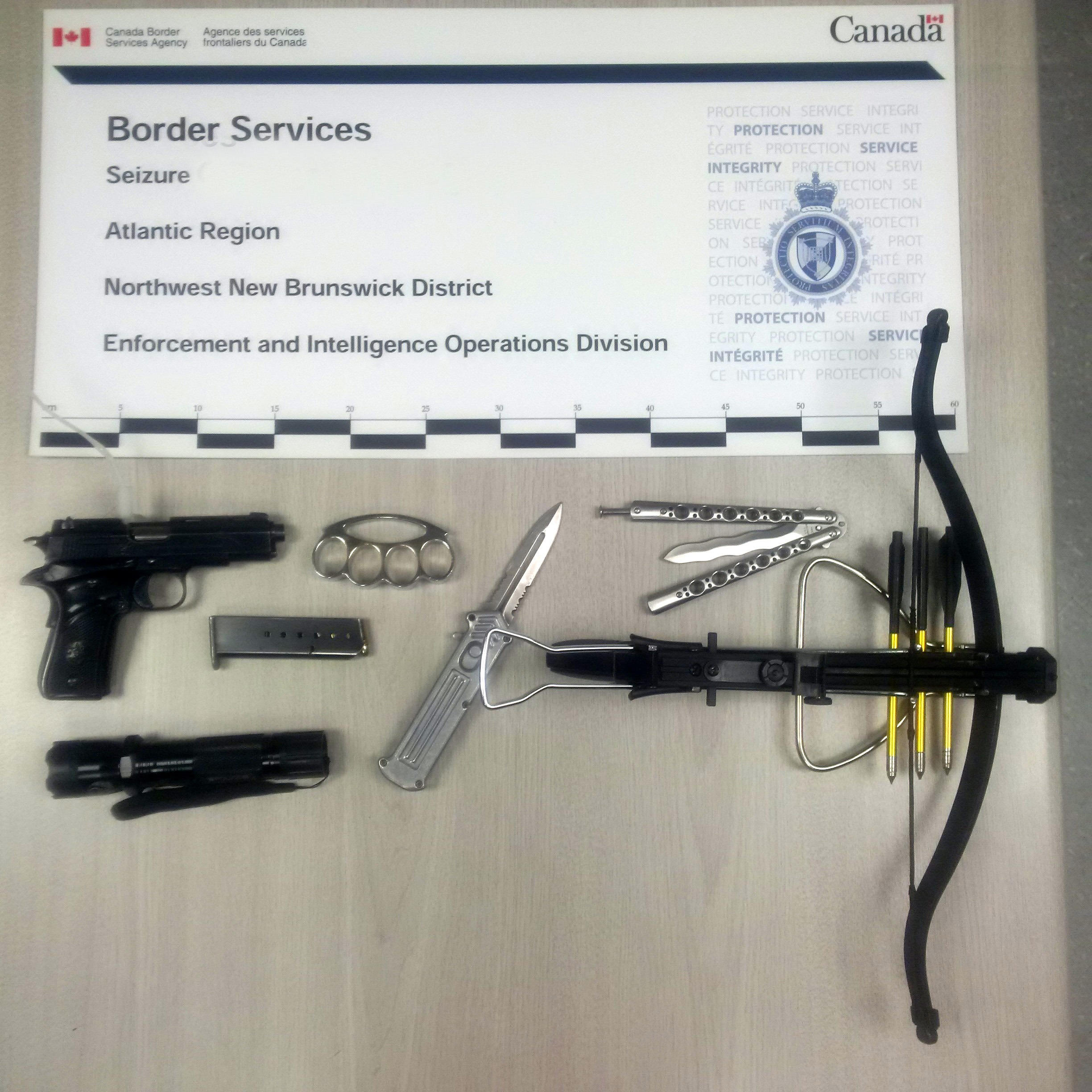 Kyle Benjamin Vickers, 39, of Fredericton has been charged under the Customs Act for smuggling or attempting to smuggle prohibited weapons into Canada, and possessions of goods that are prohibited from entry into Canada.