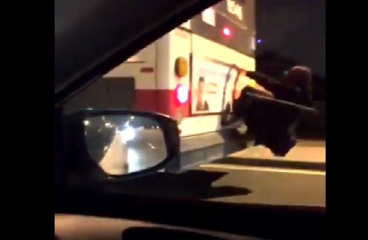 A 35-second video posted on Twitter just before midnight on Thursday appears to show a man dressed in black riding on the back of a TTC bus with both hands gripped on the rear advertisement frame and his feet on the bumper.
