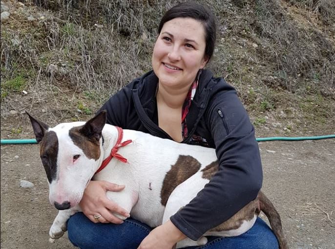 A six-year-old English bull terrier is back home after going missing when his owner’s truck was stolen in central B.C.