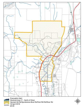 Homes north of Oliver on portions or all of Covert Place, Highway 97, Horsetail Road, Island Road, Knight Road, Pampas Grass Way, Park Rill Road, River Road, Secrest Hill Road, Sitka Road, Sportsmens Bowl Road, Test Orchard Road and Wheatgrass Road are captured in the alert.
