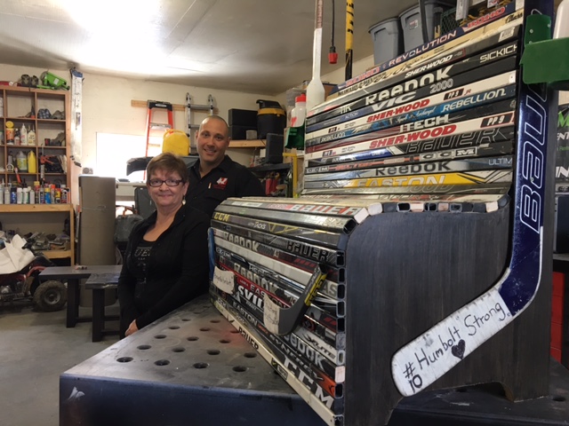 “This is good, hey,” Shaun Wagstaff said, pointing to the writing on a blade of a hockey stick. “See how it says, ‘Prayers for Humboldt.’”