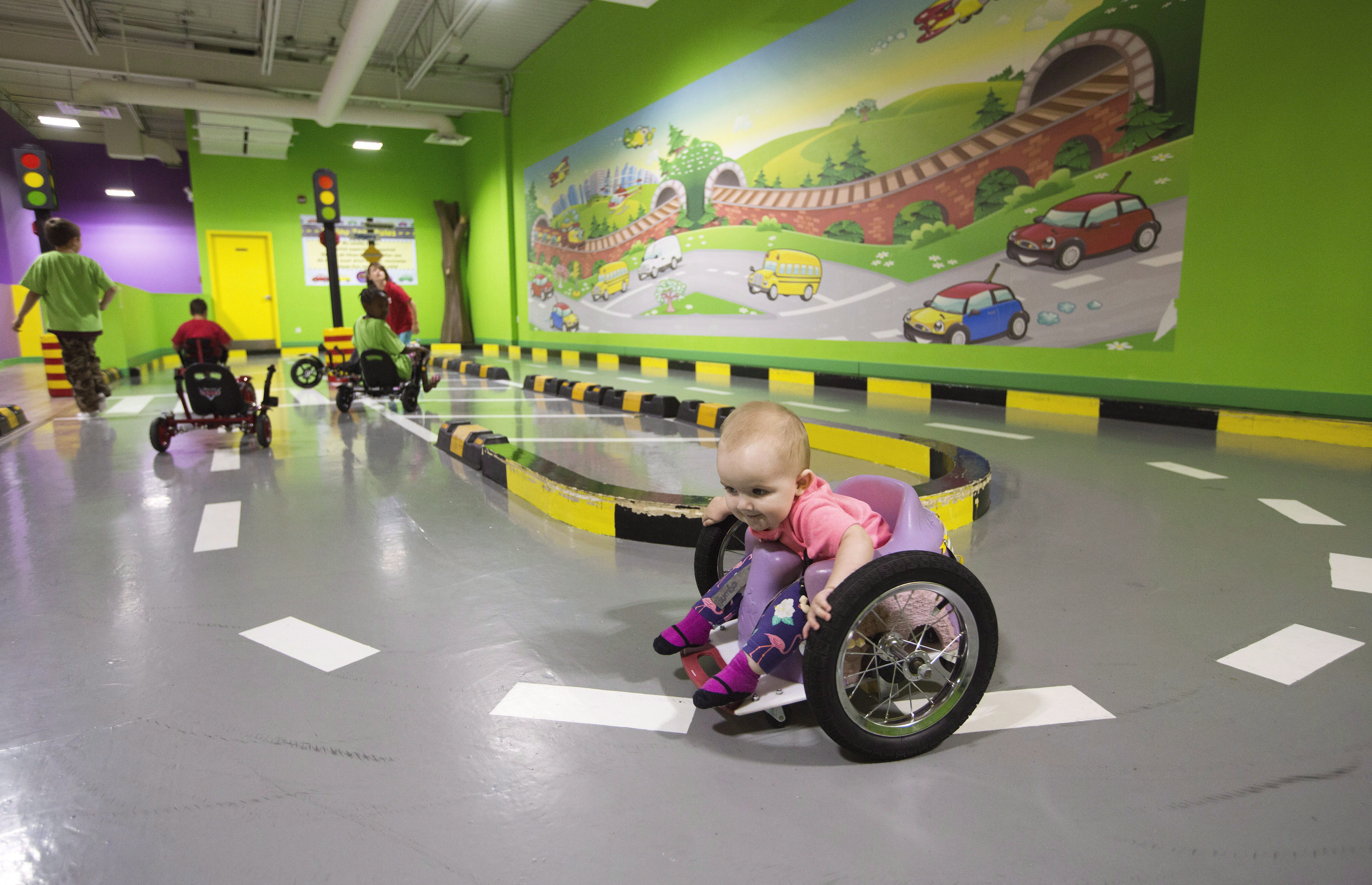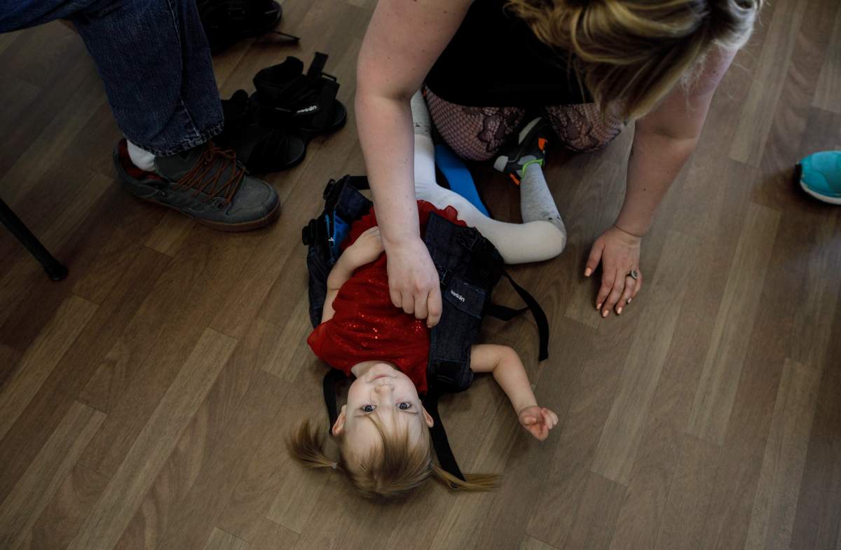“All done,” the smiling toddler chirps as she’s unbuckled and carried off to continue her exercise routine.