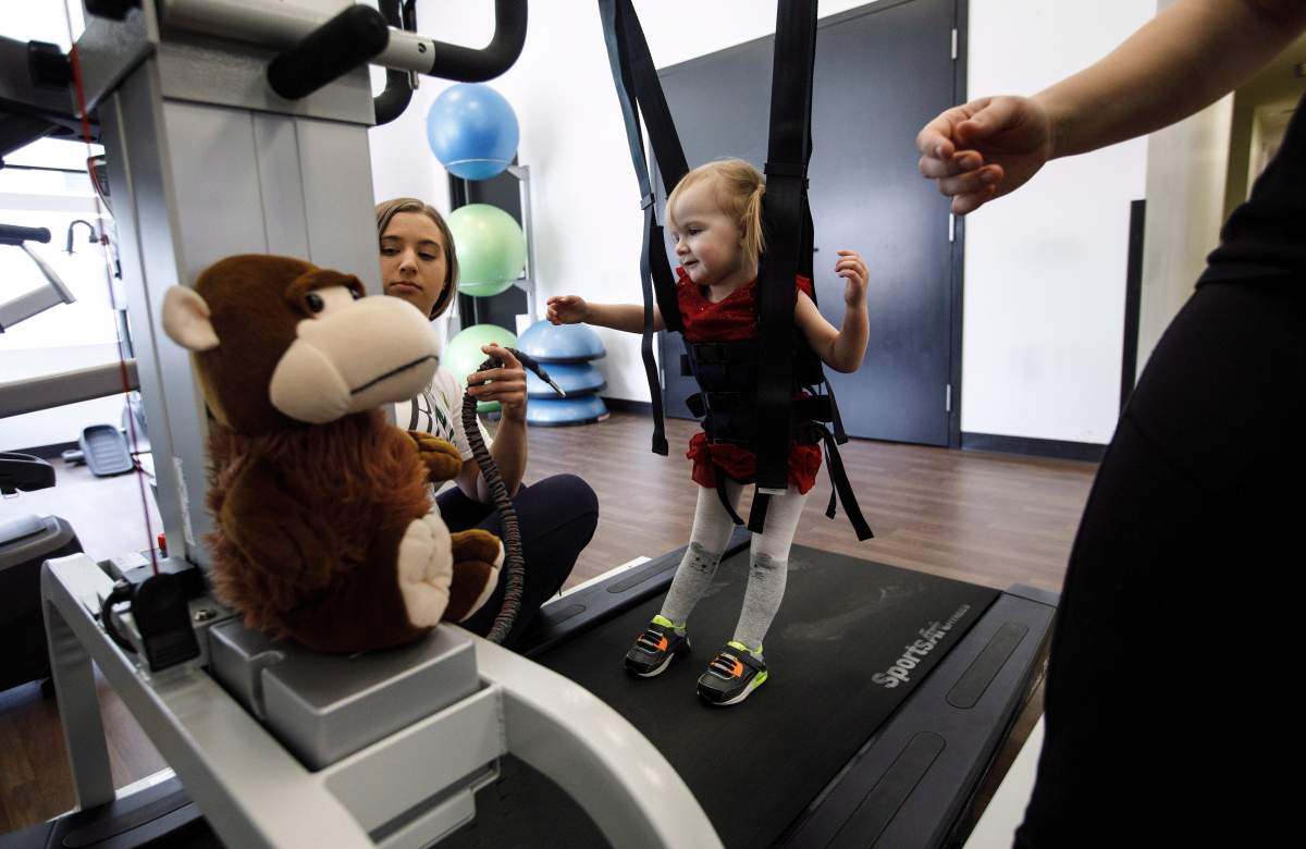 By getting Evelyn on a treadmill for nearly an hour three to five times a week, even though she can’t walk on her own, she has gained bladder control, strengthened her immune system and developed muscles, says Gill.