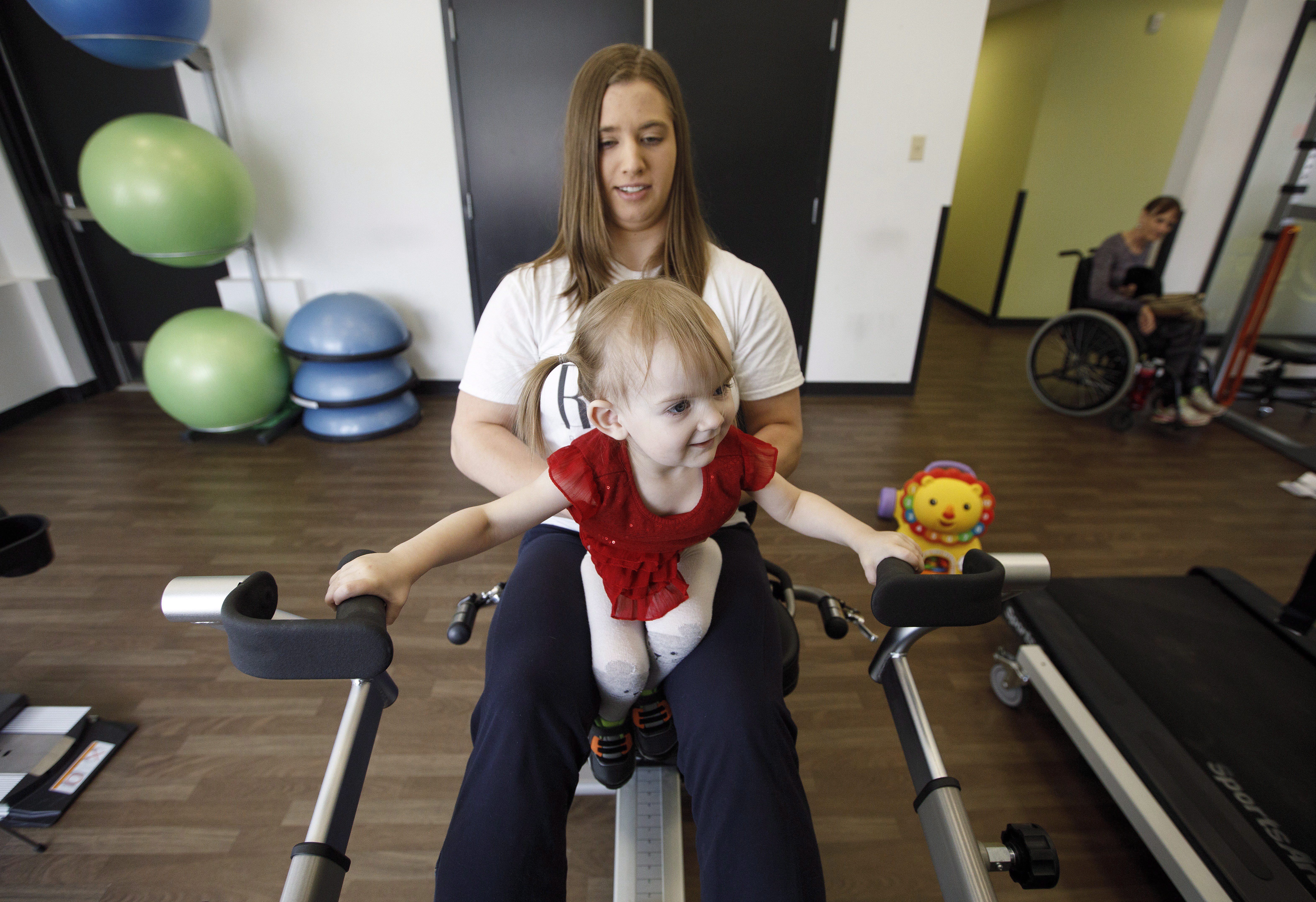 The paralyzed 2 1/2-year old is strapped to the machine with a special harness, as two health workers lift her legs up and down to complete each step.