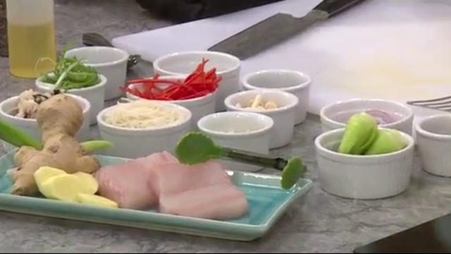 5. Place the Lingcod in the same wok and sear for 5 minutes on each side, remove fish and keep warm.