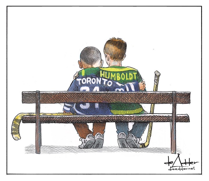 The cartoon by award-winning cartoonist Michael de Adder depicts two young hockey players, one in a blue and white Toronto Maple Leafs jersey, the other in a white and yellow Humboldt Broncos journey. The two players are sitting on the bench, hockey sticks at their side, and arms around each other’s shoulders.