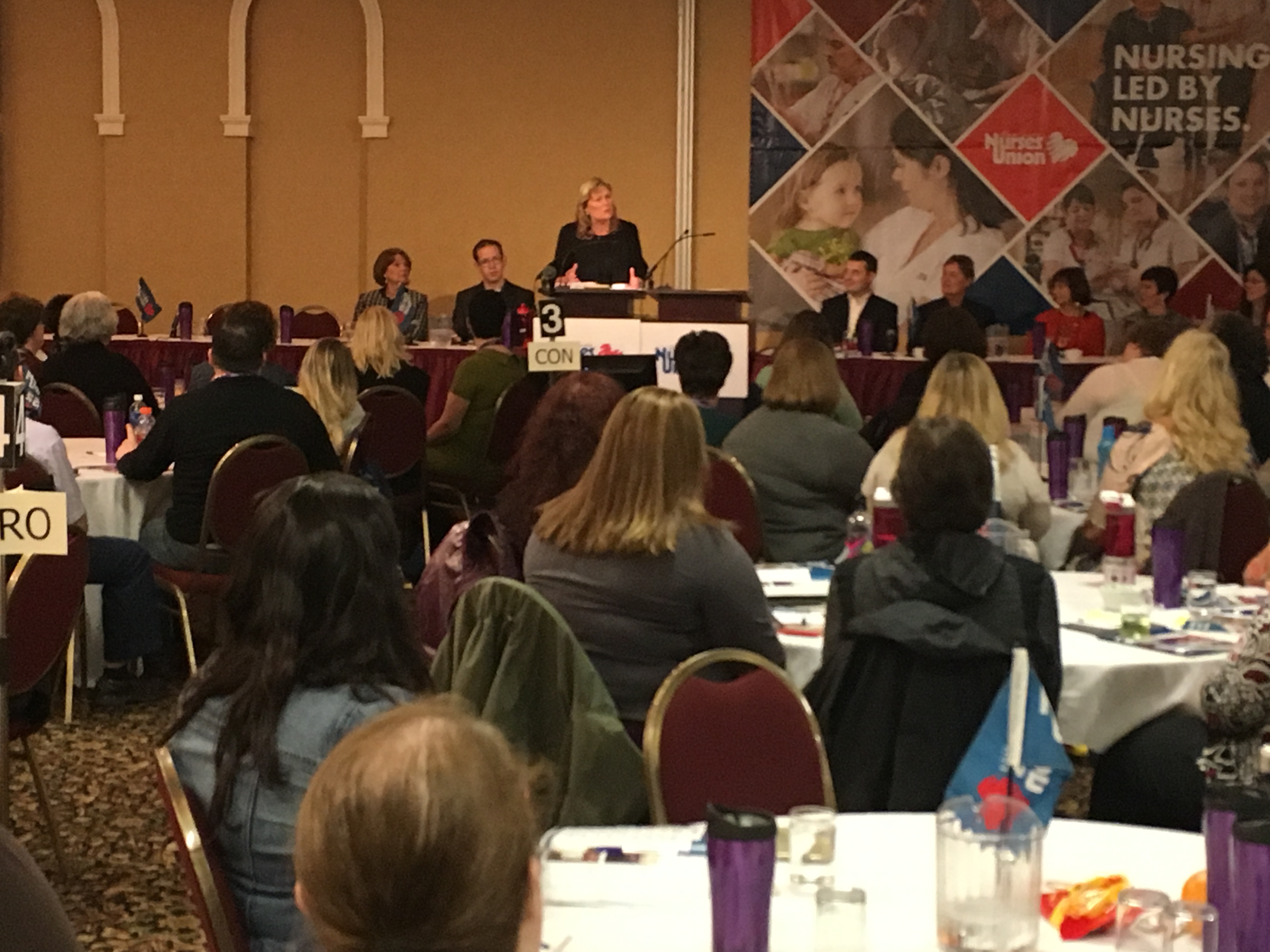Union President Janet Hazelton began Tuesday’s proceedings speaking to the over 250-person crowd about the difficulties associated with nursing. Hazelton indicated in decades past, nurses were struck on a regular basis without thought of reporting such instances.