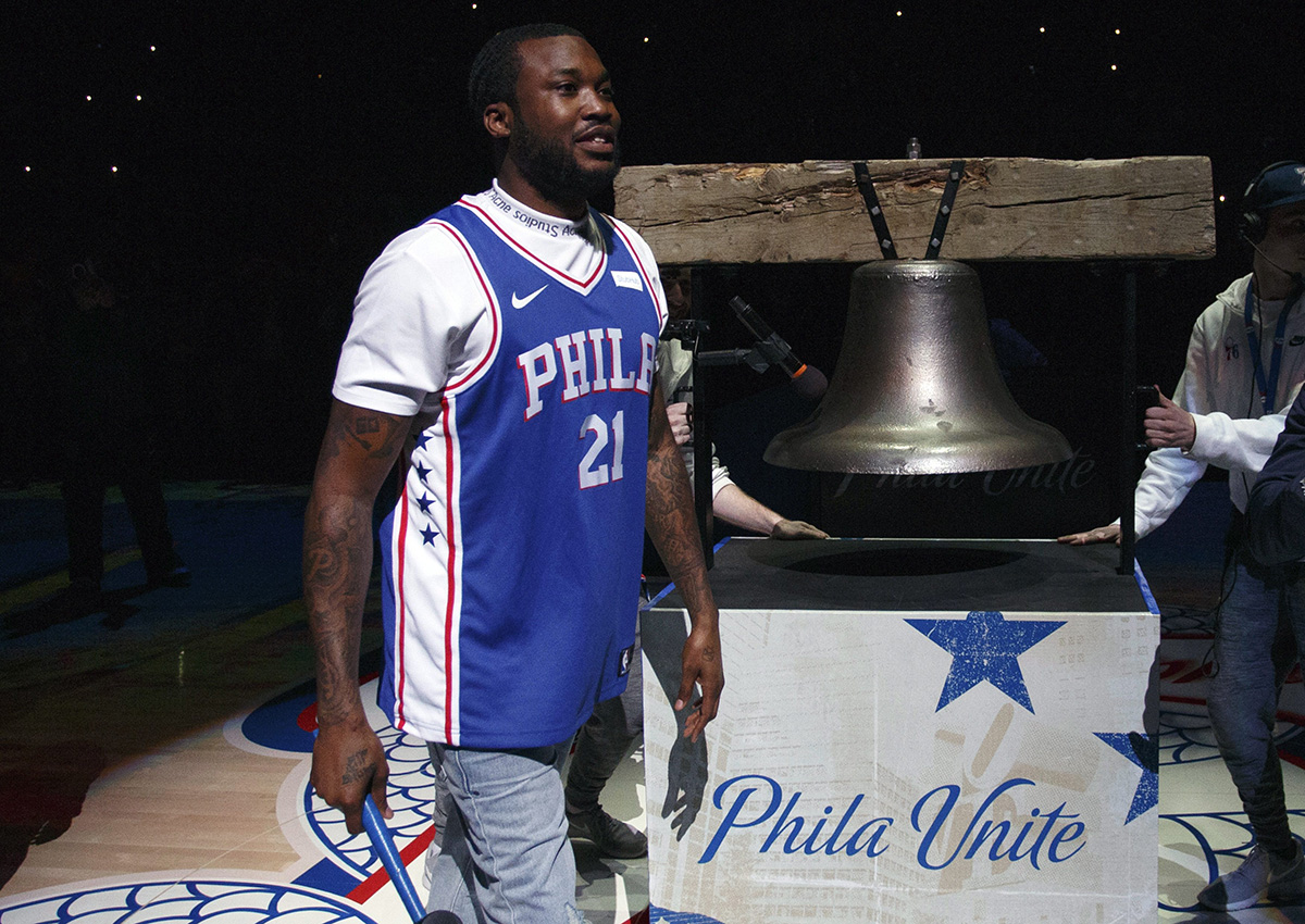 “Welcome home Meek Mill,” said the game announcer to the rapper, who was sitting courtside next to actor Kevin Hart and Sixers co-owner Michael Rubin.